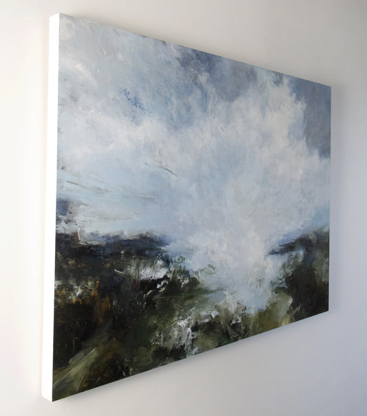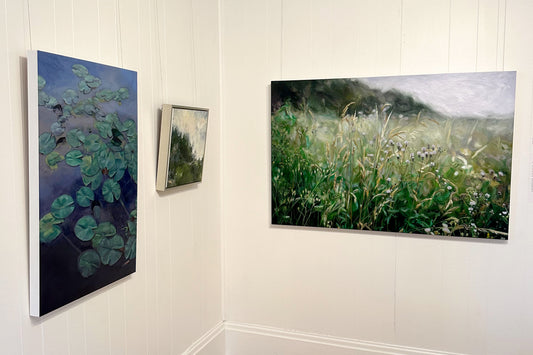 The landscape acts as a framework for emotional experiences, captured through weather, plants, and other natural elements. Paint is applied with brushes, knives, and other tools to build textured layers and subtle tonal variations.