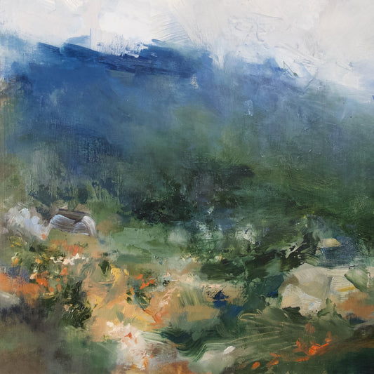 The landscape acts as a framework for emotional experiences, captured through weather, plants, and other natural elements. Paint is applied with brushes, knives, and other tools to build textured layers and subtle tonal variations.