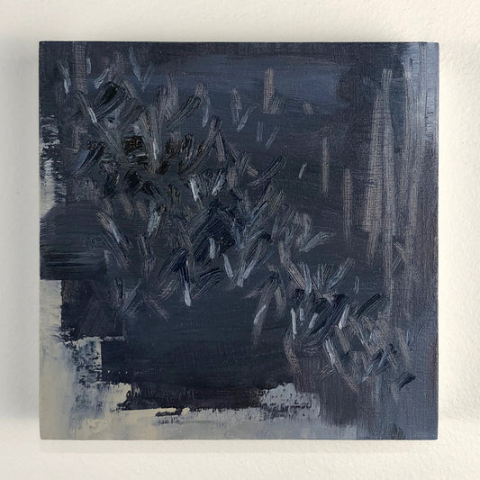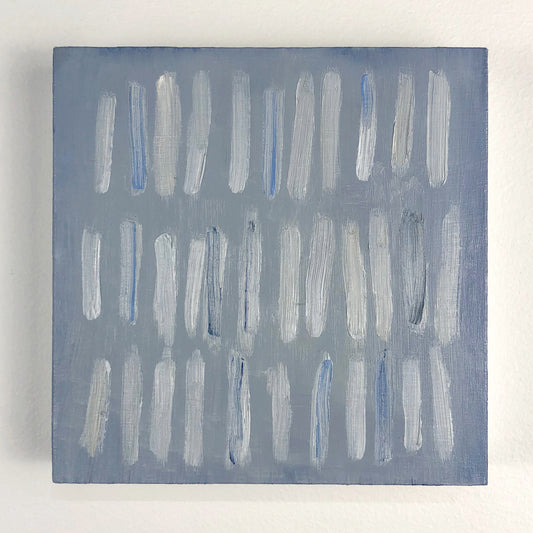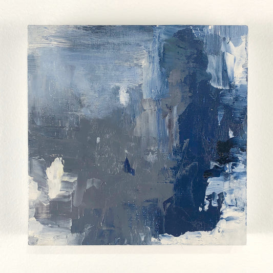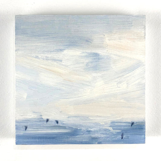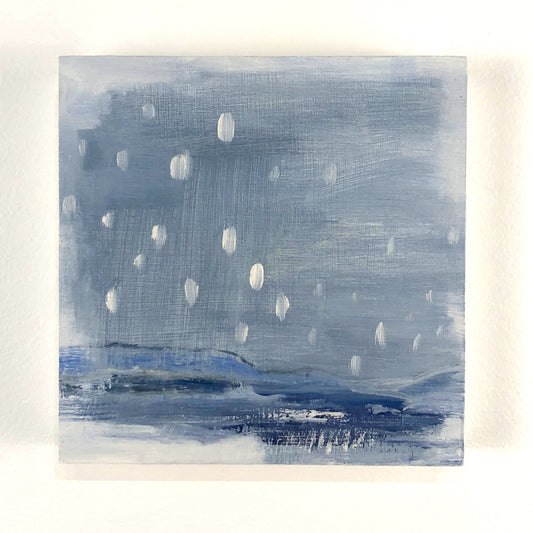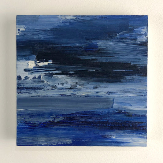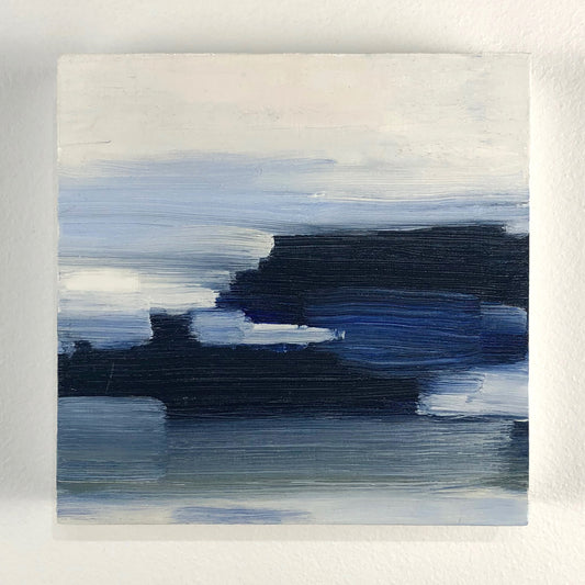 Coastlines, night skies and dreamy patterns complement each other in this ongoing series of mini paintings. At 5x5" each, these tiny paintings can hang individually or be arranged in a group of any size. A limited palette of ultramarine, white, yellow ochre and crimson captures a sense of calm.